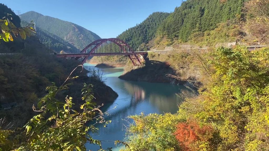 写真ではわかりづらいですがダム湖の水の色は鮮やかなエメラルドグリーン、紅葉の時期も重なってまさに絶景。