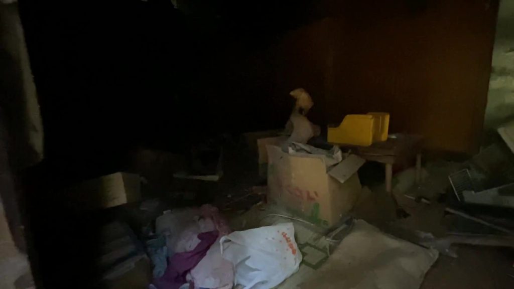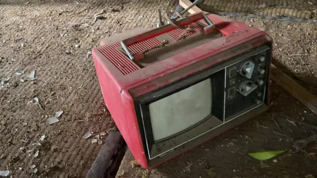 扇風機や冷蔵庫、当時の新聞記事など当時のまま時が止まってしまった空間。今にも崩れそうなので中まで入ることは不可能。