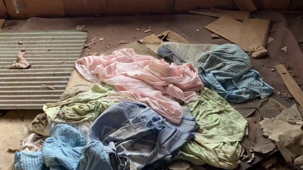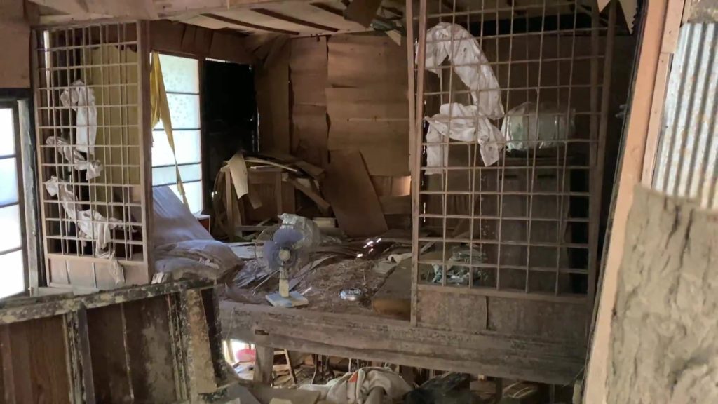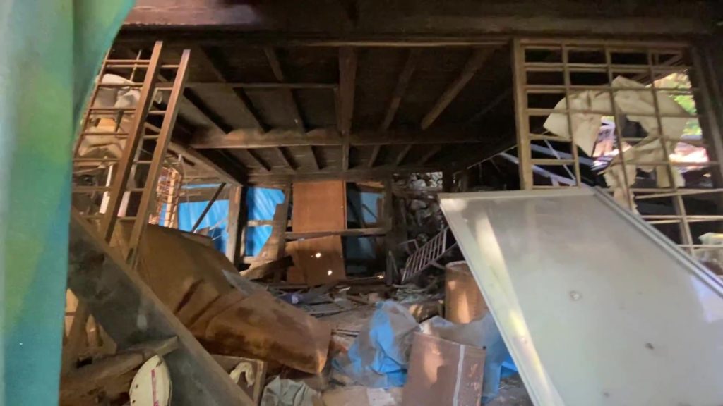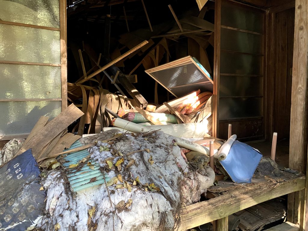 母屋はこの荒れよう、、なぜか大量の布団がありました。
