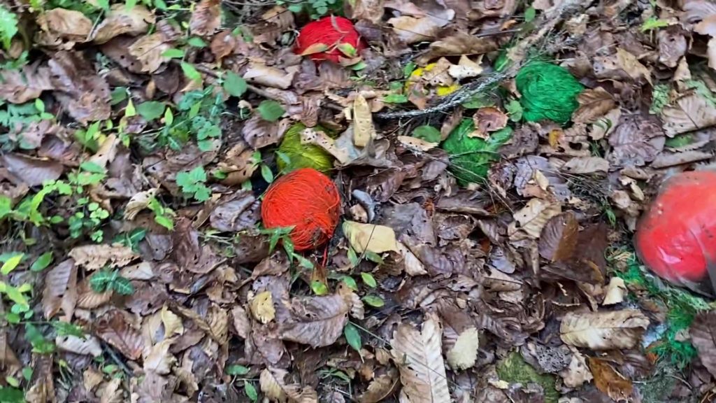 地面には赤い毛糸が複数落ちていました。