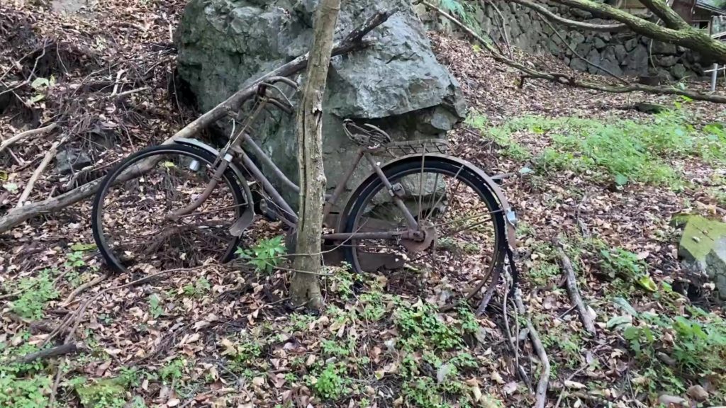 廃墟の周辺には土にめり込んでしまった自転車が。時の経過を感じさせます。